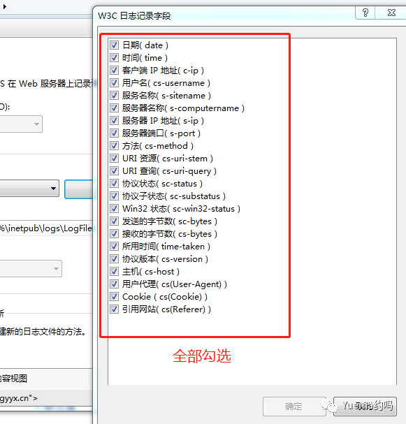 因为默认的grok规则配置是记录所有IIS字段,而IIS默认的log没有输入所有的字段,打造IIS站点日志配置,将其他没有输出的字段都勾选上。