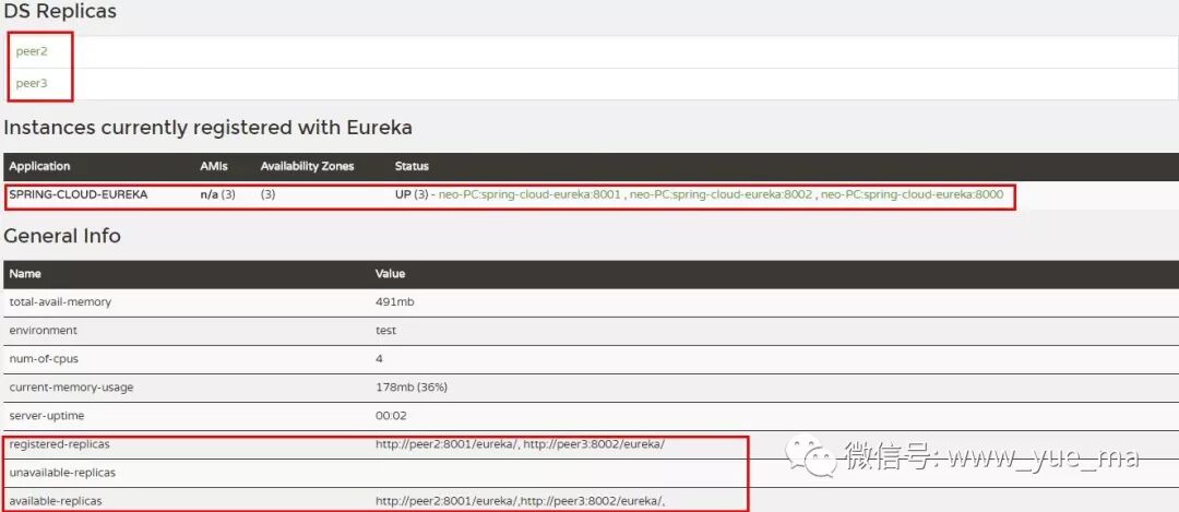 可以在peer1中看到了peer2、peer3的相关信息。至此eureka集群也已经完成了
